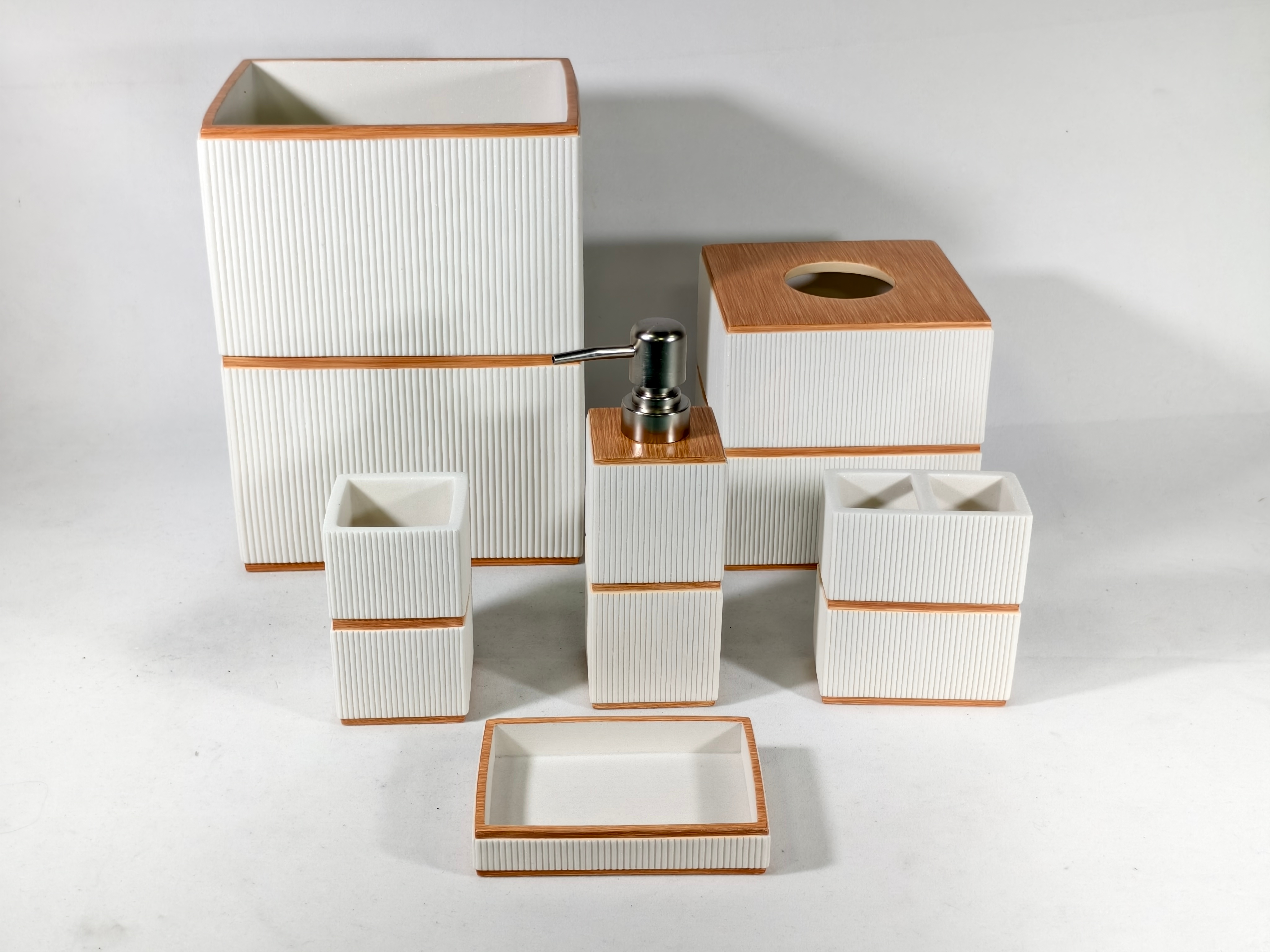 A bathroom accessory set is a collection of functional items that are used in bathrooms to serve practical purposes while also adding an element of design. These sets usually consist of products such as soap dispensers, toothbrush holders, towel racks, toilet brushes, shower caddies, and wastebaskets, all designed to complement each other in terms of style and functionality.